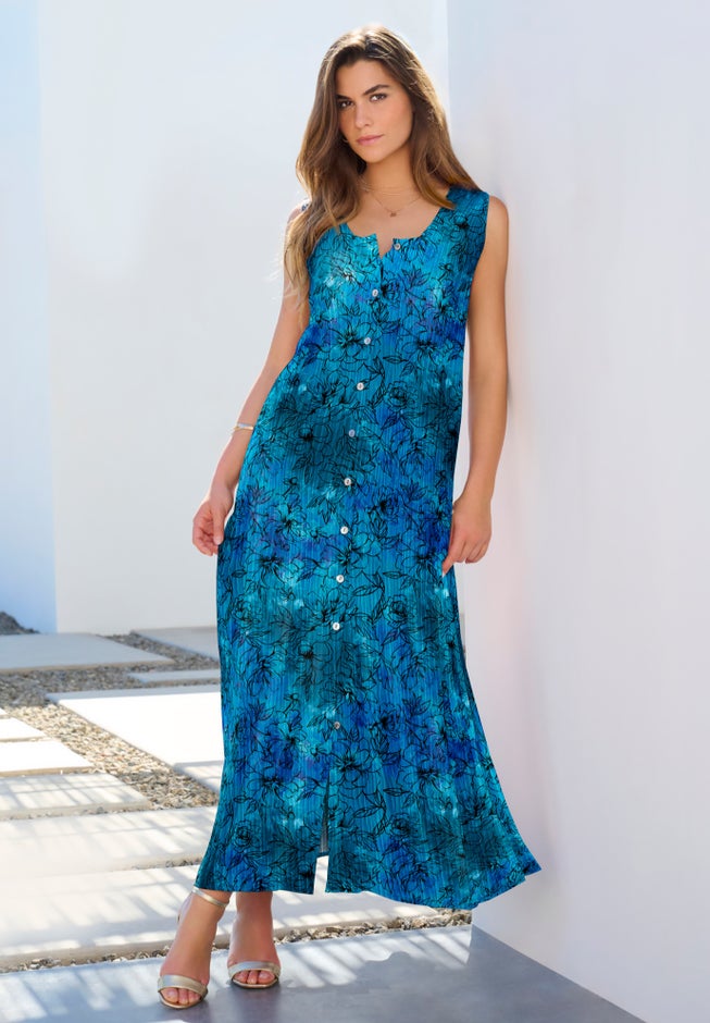 Plus Size Sleveless Hand-Crinkled Button-Front A-Line Maxi – Curvy Breezy Dress