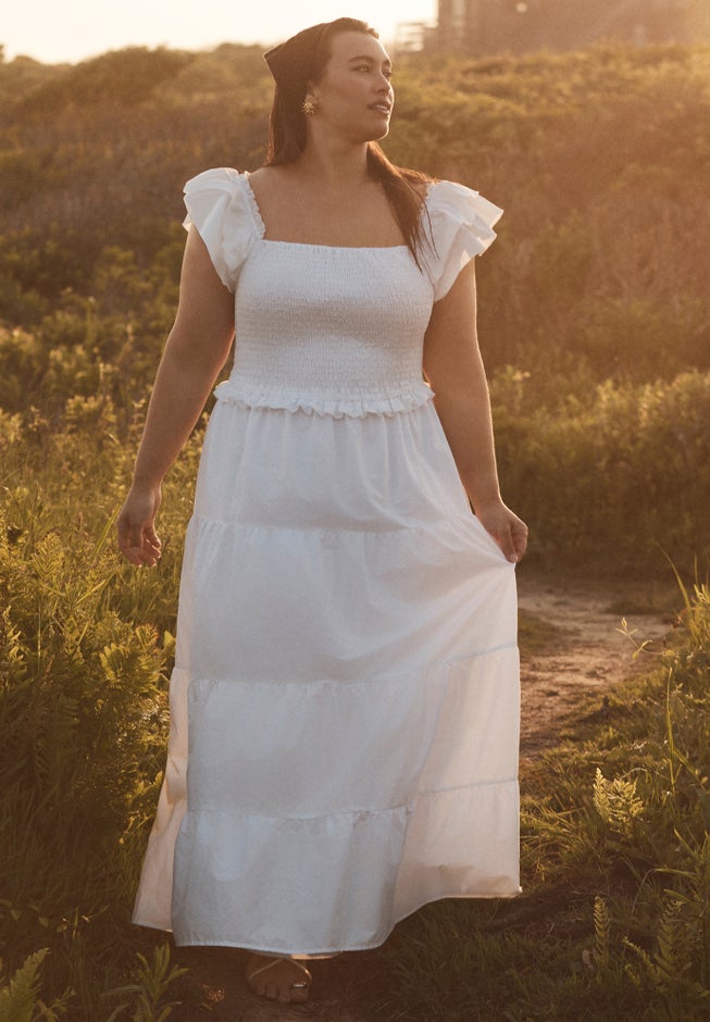 This charming maxi dress features flutter sleeves, a smocked bodice, and four evenly spaced skirt tiers with playful ruffles at the waist and tier edges. A relaxed fit with elastic at the waist and sleeve caps for a flattering, feminine silhouette.