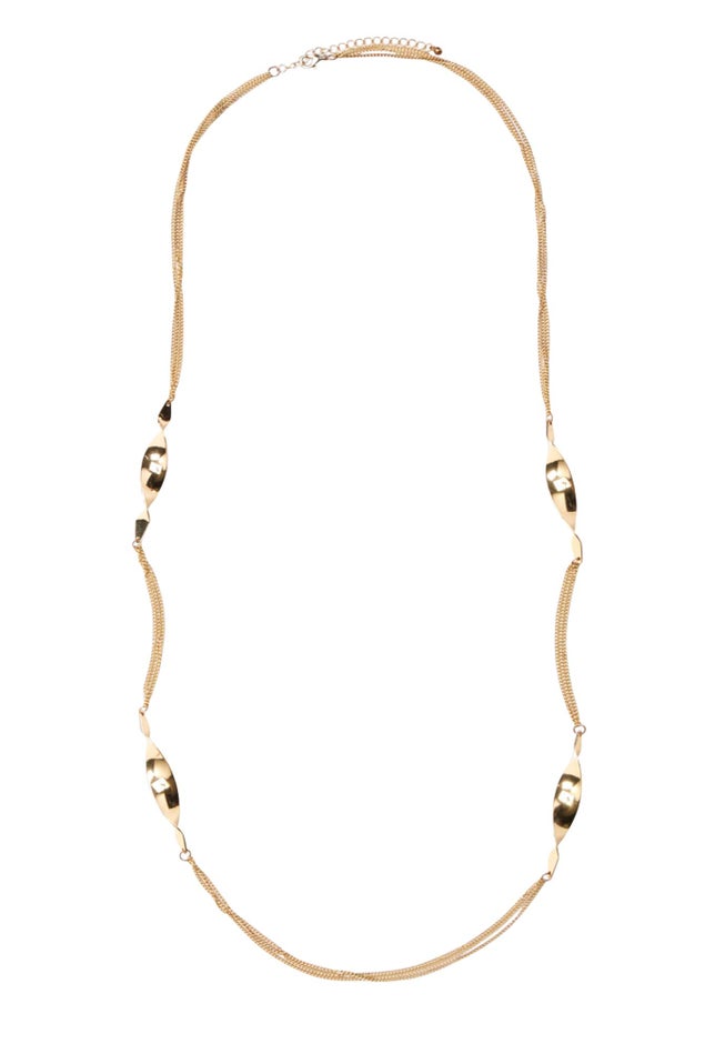 Style with a twist! Four twist accents spaced along a triple chain necklace.